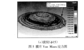 從式⑵中可以看出,當r=0(圓心)時,變形最大;當r二R時, 變形為0。從圖4可以看出,無論板式或波紋膜片’中心位移(形 變)最大;說明理論和有限元分析是完全吻合的。但若根據彈性力 學可得,位移(形變)越大,則應力越大,可是實際上,仿真結果發 現應力最大點不在膜片的中心位置(r=0),如圖5所示。實際上中 心位置的變形是整個膜片變形的一個疊加,故最大應力點不在中 心點;同時可以看出,波紋式的最大應力要比板式的小很多;所以 工業中多采用波紋膜片式;值得提出的是,波紋膜片中心平板直 徑越大,則應力也越大。根據此分析,可以設計中間薄,向邊界遞 增加厚的膜片來提高其性能。