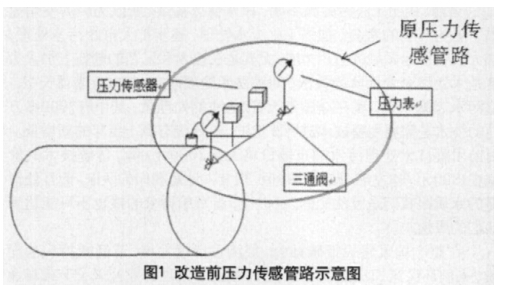 如圖1所示,左右兩個壓力表直接連接在壓力傳感管路的三通閥 上,左右兩個壓力傳感器直接通過絲頭安裝在壓力傳感管路上,整個 壓力傳感管路為密封狀態,就像一個死胡同,雜物只能進不能出,沖 洗時需要爐體內無蒸汽壓力時整體進行拆卸。