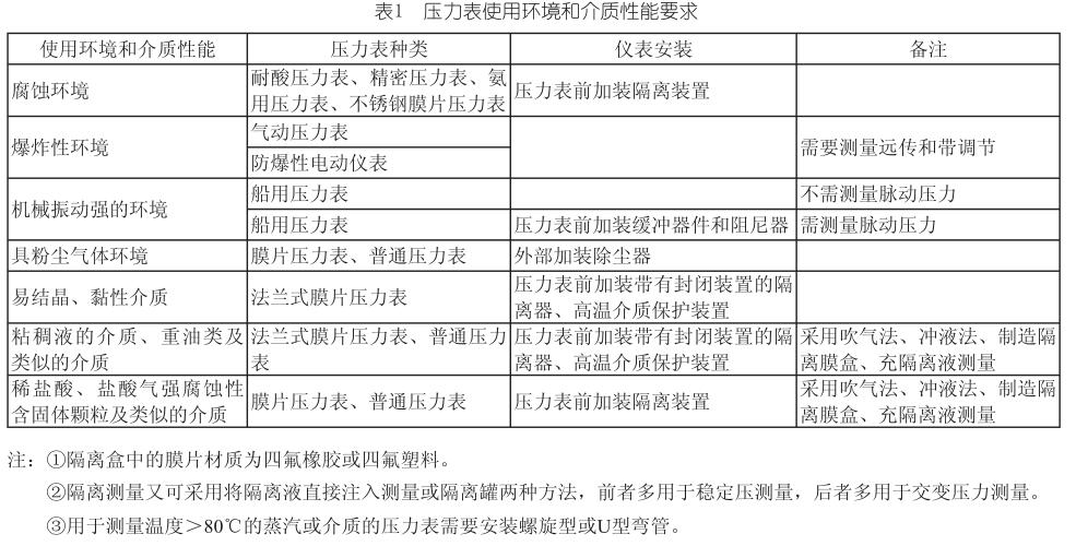 根據(jù)壓力表使用環(huán)境和被測介質(zhì)的不同,如環(huán)境溫度、腐蝕情況、振動、介質(zhì)易燃易爆等,選擇不 同類型的壓力表,詳見表1。