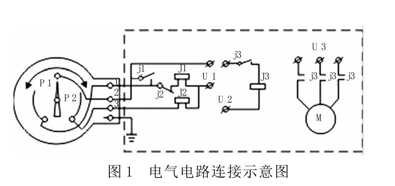 電接點壓力表是由彈簧管壓力表加裝電氣接點 所組成,除就地指示外,還用于發出壓力越限信號。它 的測壓原理是基于測量系統中的彈簧管在被測介質 的壓力作用下,迫使彈簧管末端產生相應的彈性變形 (位移),由固定齒輪上的指針將被測值在度盤上指示 出來;與此同時,帶動接點觸頭產生相應的動作(閉合 或斷開)以使控壓系統中的電路得以接通或斷開’從而 實現自動控制報警和現場指示的目的。電氣電路連接如圖1所示。
