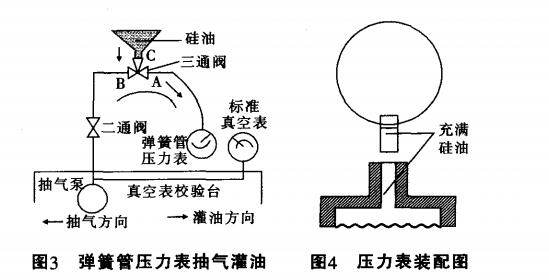 此時彈簧管內可能帶進變壓器油,可用手抓住表甩 幾下,把彈簧管內的變壓器油甩凈。將彈簧管壓力表頭朝 下,裝于真空表校驗臺上,如圖3所示。二通閥置“通”位 置,三通切換閥A、B通,C不通。用抽氣泵抽氣,抽到標準 真空表指示真空度大于0.93Pa,越大越好。如真空度小于 0.93Pa,則抽氣系統密封不好,彈簧管內充油后會有小氣 泡影響準確度。首先使二通閥置“斷”位置,然后撥動三通 切換閥,使A、C通,B不通,硅油被充進表內。為使彈簧管 內因灌油時帶人以及抽氣不盡而留有的微小氣泡逸出, 最好停lOmin后再將壓力表拆下。