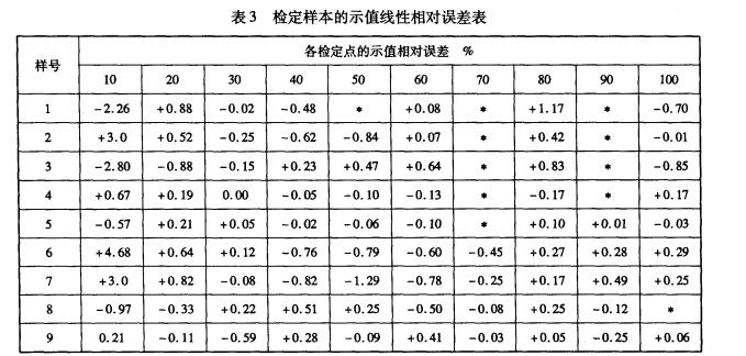 ui = ((Pi ~ P?/ P?) x 100 (式 1) 由式1得到的各樣本在相當(dāng)于裝置工作壓力 10%?100%范圍內(nèi)各檢定點的示值線性相對誤差如 表3所示。