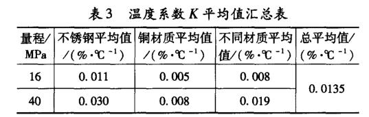 根據(jù)JJF 1415 -2013《數(shù)字式壓力計(jì)型式評(píng)價(jià)大 綱》計(jì)算溫度系數(shù)尺的平均值,見(jiàn)表3,從表3可以看 出:不同量程、兩種材質(zhì)的溫度系數(shù),平均值均小于 JJF 1415 -2013 中 0.04%/r 的要求。