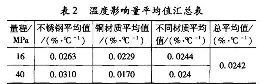 此次試驗(yàn)在-10 ~50 t溫度范圍內(nèi)進(jìn)行,壓力表 共32塊,溫度影響量平均值見(jiàn)表2。從表2可以看出, 不同量程的溫度影響量平均值比較一致,且銅材質(zhì)較 不銹鋼材質(zhì)溫度影響小。因此,在-10 ~ 50 T內(nèi)所測(cè) 彈簧管壓力表的壓力值可以參考總平均值0. 0242%/^ 修正到20=10時(shí)的壓力值。