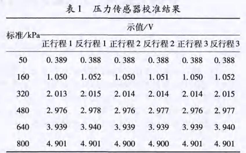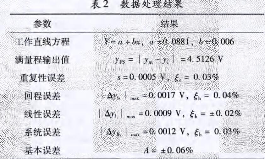 根據采集卡采集到的傳感器輸出數據,系統自動 進行數據處理得出檢定/校準曲線,便于工作人員快速 準確地了解傳感器的特性數據處理結果如表2所示。