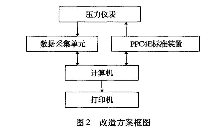 依據PPC4E壓力標準裝置自身特性對其進行遠程 控制,實現自動檢定/校準。其系統主要由PPC4E標 準裝置、數據采集單元、計算機、打印機、以及被檢 壓力儀表組成,采用串口通訊保證準確快速的數據交 換。改造方案框圖如圖2所示。