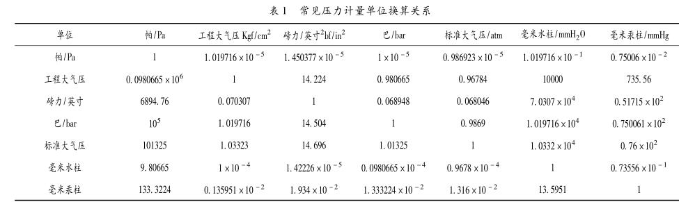 規程規定,壓力表使用法定計量單位為Pa (帕 斯卡),或是它的十進倍數單位:kPa、MPa等。但在 實際工作中,部分進口儀表使用bar (巴)、Psi (磅每 英寸)作為壓力單位,一些工程實踐領域還使用到工程大氣壓、標準大氣壓、毫米水柱、毫米汞柱等壓 力單位,常見單位的換算關系如表1所示。