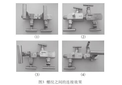管螺紋的加工多采用車削、銑削和滾壓方式, 車削和銑削是采用切除材料的方法加工,滾壓是采 用使材料塑性變形的方法加工,生產(chǎn)效率更高且表 面粗糙度更小。加工方式和加工過程控制的不同, 可能會對螺紋的精度產(chǎn)生影響。將同一塊壓力表與 三個(gè)同一規(guī)格類型的二閥組進(jìn)行連接,手動(dòng)擰緊后 的效果如圖2所示。