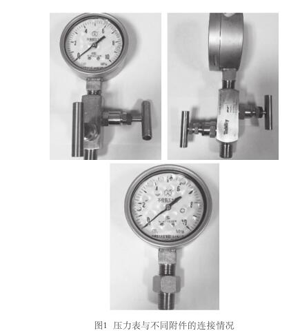 輸氣站在安裝壓力表時(shí),為保護(hù)管道焊接式接 頭,常附加二閥組或轉(zhuǎn)換接頭來連接壓力表。而壓 力表的安裝程度并不完全一致,無論是旋入到接頭 的圈數(shù)還是表盤的最終朝向都有所差異。將同一塊 壓力表分別與二閥組、轉(zhuǎn)換接頭進(jìn)行手動(dòng)連接,擰 緊后的效果如圖1所示。